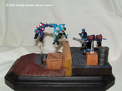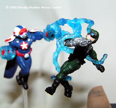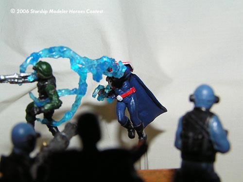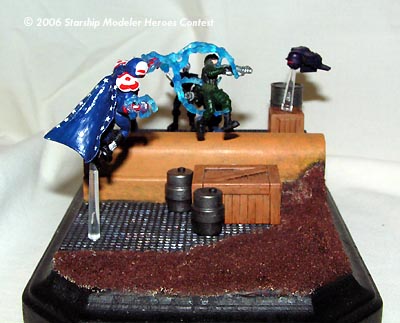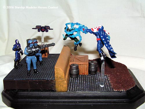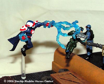 This contest was the excuse I needed to finally build a model of my character from the videogame "City of Heroes." MegaMarine was converted from a Heroclix Ironman figure; the left arm was repositioned, his head is a WH40k spacemarine helmet puttied and sanded, the boots are from a WH40k catachan guardsman, the energy blasts are from an X-men storm action figure, and his cape is made of greenstuff. He was then painted GW Regal Blue with detailing in Blood Red, Skull White, Mithril Silver, Chaos black and Ice Blue.