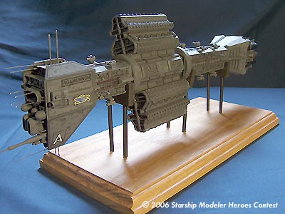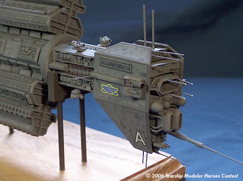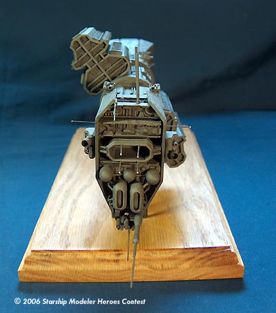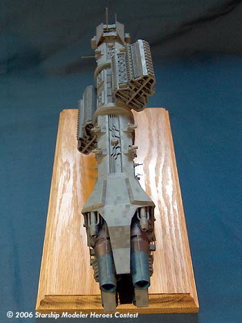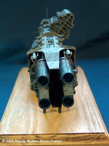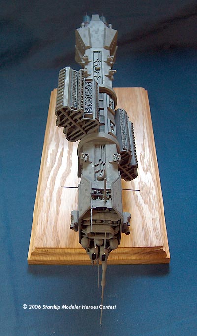 Painting was done with Testors primer and Testors Battleship Gray overall. Escape pods were painted flat red and the tips of lighting masts were done with flat white. Several washes were done to bring out detail and improve appearance.
