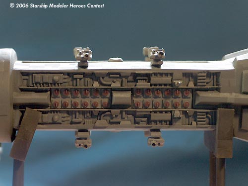 The "paneling" effect was the most tedious part of the job and my own idea. I sprayed a sheet of clear decal film with Battleship Gray and then streaked it with light and dark brush strokes. The sheet was then diced with an X-acto knife and metal ruler into tiny rectangles which were hand placed, one decaled panel at a time. Many batches of panels were placed!After all the large panels were placed I decided a second round of smaller panels was needed, as the first ones seemed a little large by themselves. The overall effect comes close to matching the CGI model in the series.