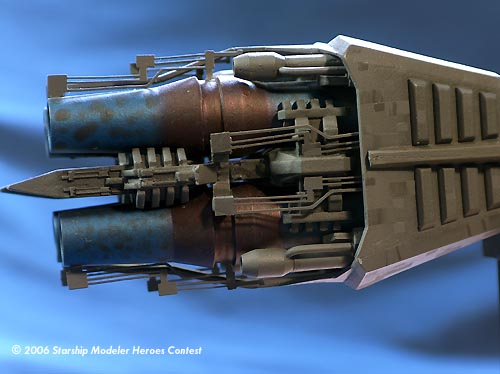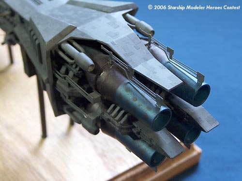 The engines recieved special painting, first with metalic blue and then the centers were sprayed again with metalic red to create a heat distressed metalic finish. They were then dabbed with thinned black metalic to create a "worn" look.