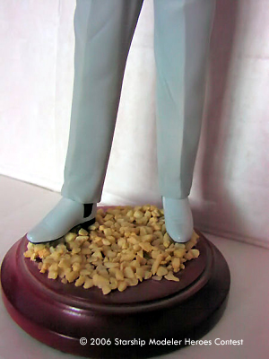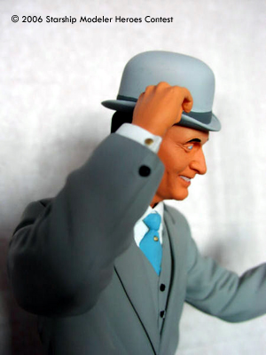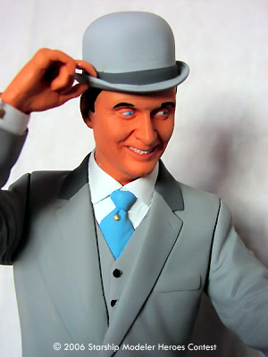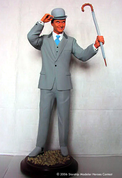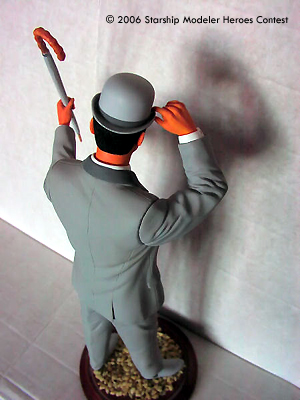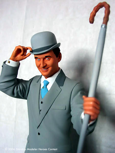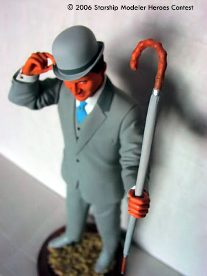 John Steed was released back in 1998 by Juniper, a UK garage kit company, and was limited to 3000 editions, and now sadly out of production and very hard to find. I found mine at Comet Miniatures in London. The kit is made of resin, and is not a solid resin cast but Hollow cast, which made pinning almost impossible. Construction is straight forward, but a lot of work was required on it as the seams were very bad. Painting was done with Tamiya Acrylics, with the Grey used on the suit my only mix and the hat and shoes a lighter shade of the same grey mix. The Handle on the umbrella is actually very thin leather brown as is the end of the umbrella. All this was done by airbrush and a lot of masking tape.