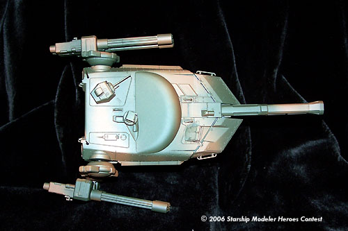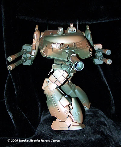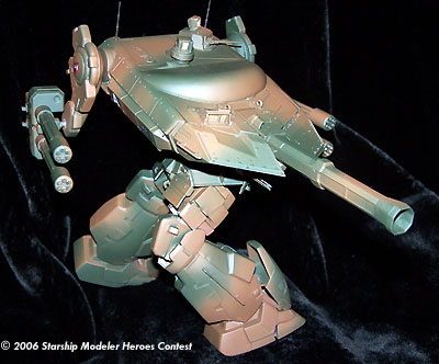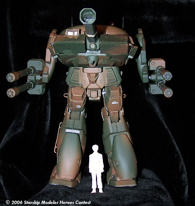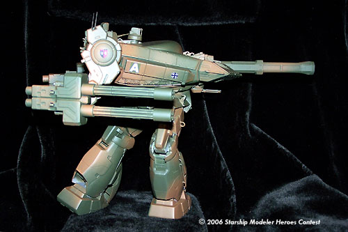 This model is a kit bash of a Panzerjägermecha, an 8 meter, 40 ton tank-hunter mech having a crew of two, commander/pilot and gunner. This mech has armament consisting of a 200 mm recoilless gauss cannon as its main weapon, four 30 mm recoilless rotary cannon as secondary systems mounted on independently movable mounts (arms), shoulder mounted anti-air and chin mounted anti-ground weapon systems. It is powered by a 30 GW shielded fusion reactor housed in the torso, providing for a top sustainable ground speed of 100 kph and a vertical ground clearance of 4.8 meters.