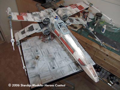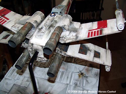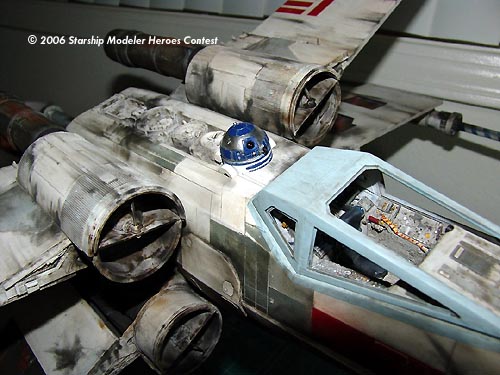 I started the model by shaping the fuselage from a block of balsa wood and matching it to photos of the original model. After I sanded the body down completely smooth I covered it in sheet styrene. I then scribed the panel lines onto the body. I then ran the fiber optics to the cockpit and R2 unit. I would go back and complete the fiber optics when I detailed the body.