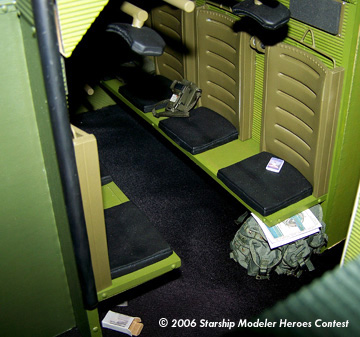 To avoid a monotonous colored interior, I used a palette of green colors. To differentiate and draw attention to interior spaces and textures, I mixed and matched various complementary shades of greens. The troop seating area walls and the rear bulkhead were painted with Chromate Green and the seat back and restraint bars are in OD. The seat cushions were painted black and some have repairs made from duct tape, in miniature, of course. On one of the troop seats, scratched deeply into the aluminum, it reads, “Crowe Was Here,” a small tribute to Tip Tipping, who played Crowe in Aliens.