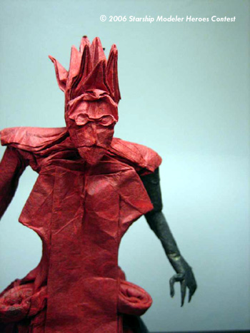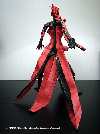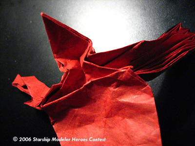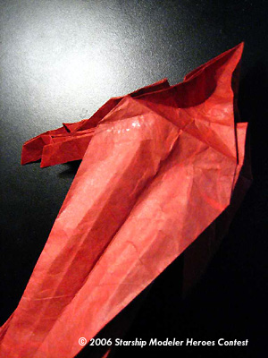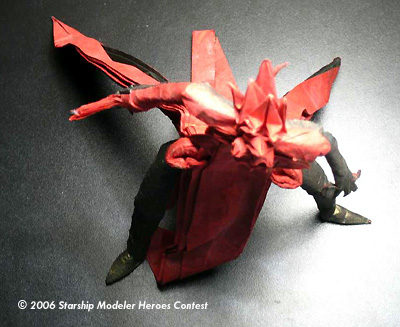 The model is designed using two origami design techniques known as "Circle packing" and "box-pleating", described in the book "Origami Design Secrets" by Robert Lang. I went through several iterations in design before folding this final version, which was folded from a single uncut 24" square of red/black paper.