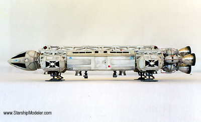 Scale: 1/72 This is an Eagle Transporter from the television series "Space:1999". It started as a 1/72 WARP kit. Modifications were made to make it more closely resemble a studio miniature. The command module, engine assembly, landing pads and passenger module were modified and made removable. The command module and engine assemblies were made removable by removing the outer ring from the kit's service module cage assemblies, which were not intended to be removed, piecing them back together and soldering to assure sturdier joints. Before soldering, the ring pieces were mated back to the cage assemblies and drilled to assure proper fit and alignment. They are now held in place with straight pins, making the assembly removable. |
