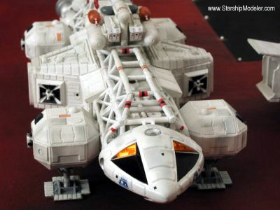 Scale: 1/96 This is the AMT/Ertl reissue of the 1/96th scale Space: 1999 Eagle 1 Transporter with the addition of Lab Pod and Spine Booster kits from Small Art Works. It is no secret that the Eagle is one of the most notoriously inaccurate kits ever produced, so I had to modify or rebuild almost every part to arrive at an accurate representation of the beloved workhorse of Moonbase Alpha. Here is a brief summary of the odifications that I made. I hollowed out the "cage" sections and scratch-built walkways, instrument shelves and missing piping with stretched sprue and many offerings from my spare parts box. The spine was shortened, narrowed and reinforced with steel wire. I scratchbuilt working landing strut assemblies using aluminum tubing, steel wire and springs. The "elbow" joints were cobbled together with bits of sheet styrene and staples (the Michael Dentzer technique). Each finished strut assembly contains over 16 pieces not from the kit. I added the missing piping for the engine support structure, shortened the combustion tanks and added accurate fuel spheres and other details. |