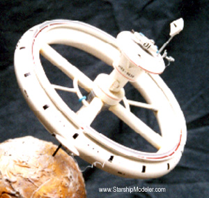 Scale: 1/100 The classic 'space wheel' design from the glory days of wonder and imagination; this is a highly modified old Lindberg 'Star Probe Space Base' kit. I rebuilt the entire hub of the wheel, extending it to give the whole construct a more balanced look. Taking the two space taxis as a guide I also decided that the scale was all over the place and so based the final scale on the oversize taxis at about 1/100 scale. This decision led me to take away most of the busy detail - i.e.- millions of rivets! The rest involved fine detailing in terms of giving the taxis crew and clear plastic canopies, scratch building antennas, airlocks and crew.Image: Top/side view Image: Top view |