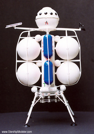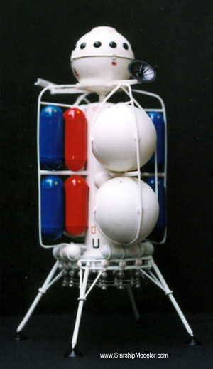 The landing legs, supports, central landing chassis, and all the support framing was made from various sizes of sheet and tubular styrene that was cut, heated, and bent to specifications. Strip styrene was used for further detailing, including the piping around the rocket nozzles. The red and blue cylinders are made from thin sheet styrene with plastic "happy birthday" balloons I found in the cake decorating section of my local Michael's for the end caps. (It took me a good week to find the proper size and material for these caps.) The entire ship was painted in basic Testor's Flat White, the radar dish is Testor's Gunmetal Metallic, and the side cylinders are basic Testor's Red and Blue. The hand detailing is mostly flat steel. Decals - including a great "Spirit of '76" decal -- are from various sources. CONCLUSION Since I was a kid - back when Dinosaurs Ruled the Earth - I had wanted to build a kit of this classic '50s design. I was already in the process of assembling the materials for my own "kitbash" when Starship Modeler announced its 2001 contest. This gave me the impetus to finally fulfill my lifelong dream. I hope it brings back pleasant memories. Image: Another side view, showing the tanks Image: Close-up of the command module, showing the "Spirit" emblem |