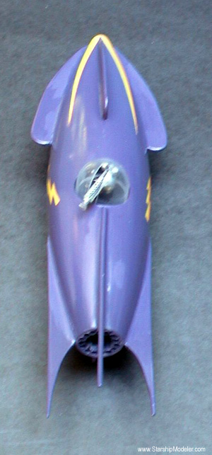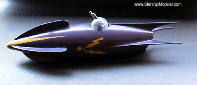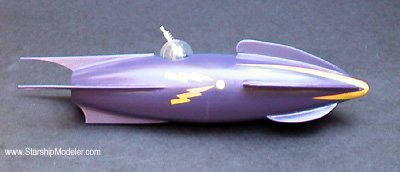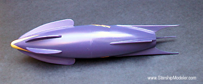 Scale: None stated This ship is loosely based on the Martian rocketship from "Zombies of the Stratosphere", a 1954 movie serial. The hull is two acrylic wineglasses mounted on a PVC pipe spine. A ring cut from a PVC coupler slip-fit at each end makes the spine essentially self-centering and asssembly much easier! I used a piece of heavy duty schedule 80 PVC, which gives the model a nice heft. Epoxy the ring in place before final assembly. The turret is a gum machine capsule and the ray gun is made from scratch. Markings are masked and painted. The model is a little less than 11 inches long overall. Image: Top/Rear view |