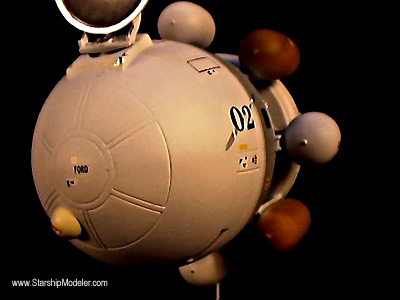 Around the perimeter of the vessel are external fuel and consumables tanks made of foamed nickel/iron melted by solar concentrators (fancy words for reflectors) and 'blown' into ceramic molds in the vacuum of space. They're rugged, ugly, and work just fine - and are easily replace or repaired if they get 'dinged' by a wandering rock. The long range antenna projecting from the habitation sphere is also foamed nickel/iron and quite expendable as it is also quite exposed. There is also a forward facing instrument dome that is quite strong - in relative terms. A good hit with a fast chunk of rock can still damage it - but it beats having that rock bouncing around in the cabin with you. Note the bright metal scratches and 'dings' on the hull. ABOUT THE MODEL I'll let you figure out what I used for the main body of the ship. Let's just say that it's from model rocketry and let it go at that. The perimeter tankage is made from little plastic capsules from vending machines - cheaper then EMA domes and quite usable. (One reason that I have so MANY little rubber robots....) The engine itself is shelled with the LEM shields from a Saturn V kit (sorry, I forgot what scale). The antenna is the bottom of a plastic food tray (chocolate pudding, I believe) and gun mounts from a HUEY chopper kit. The inner ring of 'stuff' between the front and rear modules is mainly car parts that didn't move fast enough to escape. Paint is Rustoleum White Primer, Grey primer, and Pollyscale for details, with a little Testors Chrome Silver for 'dings'. Markings are rub-on transfers from Woodland Scenics and Letraset, with one SLIXX grill decal.Image: Front view Image: Engine detail Image: Top view |