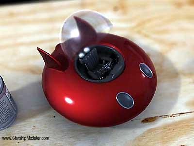ABOUT THE MODEL This model took more hours to create than I'd like to admit. The main body was lathed from high grade basswood, to the appropriate shape (the top and bottom are separate pieces with a shim between them). Many well sanded coats of primer and metallic model paint followed, as well as several highly polished layers of automotive clearcoat. The interior walls, dashboard and seat were sculpted with milliput and super-sculpey and sanded to an extra smooth finish before coating it with several layers of a custom mix of semi-gloss enamel model paint (I made the interior first as to ensure a tight fit between it and the body). The headlamp trim was bent from copper wire and painted with alternating coats of non-buffing and buffing metallizer (along with the other 'metal' trim pieces and landing gear). The dome is a custom ordered acrylic resin casting, again highly polished and fitted with a small hinge to allow for opening and closing. The steering wheel comes from an old car model (1/12 scale) and the knobs and levers are made from small sewing stick pins. The landing gear belonged to an aircraft model, customized with pieces of tubing and springs. I photographed the model surrounded by modeling material (that I didn't use, it's just there for looks, ...and scale) and some old pulp magazines I borrowed from a friend's collection when I was looking for saucer designs to base the model off of. I used a Fuji finepix4900 for the photos and some shop lights for lighting. Image: Side view |