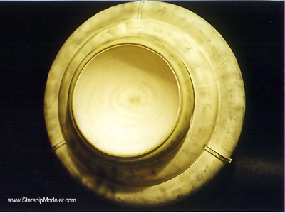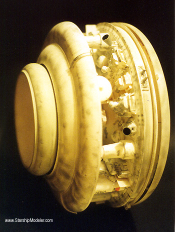 Scale: 1/300 The Mercury Explorer 1 (ME-1) was made with the idea of one side always facing the sun and the other side always in shadow. This way there is always a simple and highly redundant means of cooling the ship, inside and out. The body shield that faces the sun is internally lined with coils for the cooling process as well as a center magnetic field generator (painted light grey) to help deflect the highly energetic atomic particles continually ejected from the sun. All ships' equipment and crew living quarters are sandwiched between that shield and the other in a rotating wheel. The shield facing the eternal night of space radiates excess heat. At its center is a deep-space relay and communications dish. ABOUT THE MODEL The model was made from two large plastic platees. The internal parts (equipment and crew habitat) are made from various found parts as well as a large film cannister. The parts are made in a modular fashion for ease of construction and installation. The various parts are jettisonable as a unit. The idea for the model came from the book, "The Lost Worlds of 2001", page 91, by Arthur C. Clark. Image: Side view, shoing center cargo/storage/habitat modules Image: This side faces away from the sun. The comm array is in the center. Image: Equipment in the center section. The crews' quarters ('the bunker') are housed in the empty round section at the center. Image: Center section, with shuttle for scale. |