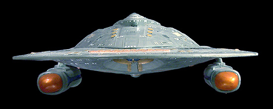About the model: This kitbash utilized a reduced Enterprise C disk and the hull section of a Star Wars Slave One. Both the upper and lower sections of an Enterprise D engineering hull were spooned and turned upside down and then tucked into the Slave One hull. The deflector dish is from a Slave One too. The underslung shuttle bay is the extra bay from the Ent. C kit, as are the nacelles. The bridge deck is from an Enterprise E kit. The color scheme is a Gunship Grey base and aztecing,, (in flat and gloss tones), a gloss gull grey defensive shield grid, and my standard copper on the phaser emitter. (Not sure why I do that, makes them look active and ready to go I guess.) I was very happy with this big shouldered, arch backed, heavy fighting ship that could kick a little Dominion ass. Image: Rear view Image: Head on Image: Port side Image: Top view |