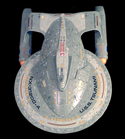 Scale: 1/1400 Federation Tactical Warship U.S.S. Tsunami NX-31200-A The Tsunami class, named for an overwhelming wave, is a rugged, overpowered, souped-up warship. In engineering, the level of crystal renegeration cycles in the warp core has been raised to force high rates of energy processing from the dilithium crystals. It's phaser emittors are rigger to fire hot by overloading emitter nodes intentionally and shunting the additional kickback discharge into the ships active defensive hull grid, strengthing the hull should the shields weaken. While this strategy shortens the life of the emmiters, power is more important than longevity in a firefight. On the sides of the massive upper, "Defensive Tackle", hull, armored ports protect the two quantum torpedo bays. Each bay when activated holds two fast repeat torpedo launchers. A protected, underslung shuttlebay is positioned to shield the launches and retrievals of attack fighters or tactical pods. An aft quantum torpedo launcher is also rigged to fire new Tricobalt devices if that level of deadly force is ulitimately required. It's solid, tested warp nacelles arepushed as well, with higher rates of plasma induction and the constant wear and tear of warp warfare. Additionally, overpowered multi-phasic regerarative shielding and the ablative armor that includes a defensive hull grid act as double padding on this bulldog. Truly a scrappy warship. |