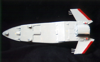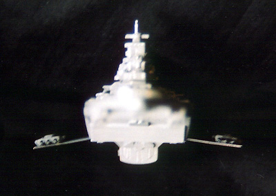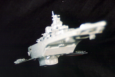 Scale: None stated The battleship Behemoth was constructed inthe hopes of decisively ending the Earth/Gresk War of the early 21st Century. Taking a cue from warship design of the mid-20th Century sea-going battleships, the 1161' (354 m) long warship possesses a trio of magna-pulse guns (one on each "wing" and one in the bow) as well as 12 laser turrets, twin nuclear torpedo tubes, a rear-facing hangar bay for attack craft, and a crew of 1200. The Model: The Behemoth is a merging of the 18" AMT/Ertl USS Excelsior kit and a foot-long Japanese import model of the USS Missouri, with warplane wings and other odds and ends thrown in. For over a year I'd had the main hull from the Excelsior kit sitting on my "unfinished business" box because I couldn't decide what kind of ship I wanted to make from it, or even what to put on the top side. Then the Starship Modeler Battlewagons contest was announced, and I knew I'd found the category I was looking for. I've always liked the battleship design of the Yamato from Starblazers, and decide on that kind of multi-layered superstructure with a lot of guns. I built the towers, bridge, side guns and stacks from the Japanese battleship Missouri kit, for the most part as they should be. These fit perfectly on the top of the Excelsior secondary hull, but backwards since it had been cut off a couple inches past the navigational deflector for use in a different project. I wanted a rough, detailed surface for the top and bottom of the ship, so I added several rectangular "hatches" made from the small numbered tabs on plastic model parts trees. I had the idea of two of the main guns projecting off from the sides, and used some spare warplane wings inserted into the aft hull to mount them. |