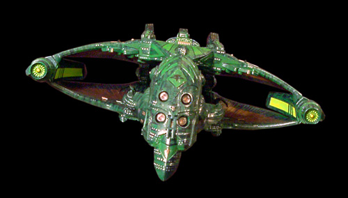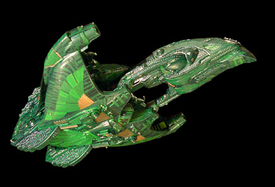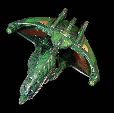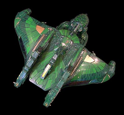 Scale: 1/2400 T'RAJAN CLASS Massive even by Romulan standards, the T'Rajan Class Capital Cruiser is a testament to the ego of the Romulan Praetor. Nearly twice the size of a Warbird, this Imperial behemoth was built as a response to the threat of the Dominion. This ship is capable of carrying nearly 4000 personnel, housed in the huge command hull and the towering fins that rise from the back. Armed to the teeth with multiple disruptor cannons capable of laying waste to a planet, and multiple torpedo bays designed to launch powerful trilithium-based torpedoes, this ship is a destructive force unrivaled in the empire. The two powerful warp impellers, powered by two distinct and independent artificial quantum singularities, can propel the huge vessel at speeds of up to warp 9 for extended periods. It's cloaking systems, while based on traditional technologies, have been updated and installed in redundant, yet cumulative configurations that amplify the output of the cloaking emitters. These innovative configurations allow a vessel of this size to be almost completely hidden from sensors, even while traveling at high warp. And its defensive systems have been reengineered to allow the ship to have its defensive shields up, even under cloak - a development that has attracted the attention of Starfleet strategists. Model Notes: This is my first Romulan kitbash, and took around five months to complete. The Command hull is built from the blade of a Star Wars Federation Tank, halved, reduced in width and placed bottom to bottom. The bottom of a Warbird command hull forms the beak, and two top necks from the Warbird kits form the side connecting necks. The main upper neck connecting the command hull to the engineering section is part of a Star Wars Slave One. The main engineering section is fashioned from two Warbird top wing segments split in half, with scratchbuilt hollow-core center sections built to widen the span of the wings. The habitat fins are also hollow-core pieces, scratchbuilt from styrene. The two Warp impellers are segments taken from a Defiant kit, and the matter collectors are the engines from a Star Wars Battle Droid kit. The surface detailing is a combination of greeblie parts taken from my parts box, and thin sheet styrene cut to form the feather detailing. The paint scheme is Testors Green Metal Flake layered over a brighter yellow green, with varying shades of green aztecing. The detail areas are brass with a brass and gold mix aztecing color. The decals were from a great decal sheet from Thomas Models. Image: Head-on Image: Underneath, again Image: Rear view |
