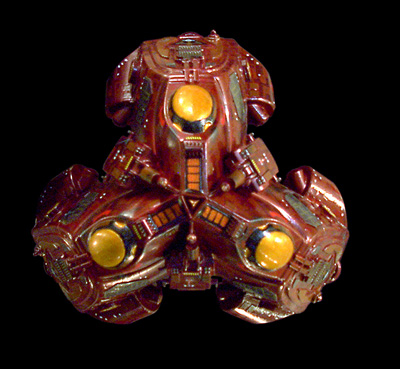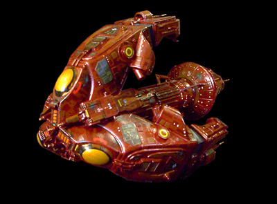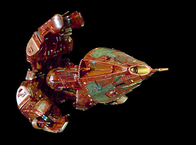 Model Notes: This Raider is one of my favorite kinds of bashes; a ship made out of tons of tough-to-use, garbage box materials. Three main sections of the Star Wars Federation Tanks, modified to remove the weapons turrets and blend the joints of the three identical sections, are assembled in triangular formation. A triangular, thick piece of styrene acts as a center support to hold the three arm/blocks in place and form a floor for the core column to attach to. Miscellaneous greeblies and cannon parts were used to create the transitional spaces between the three arm/blocks, creating the matter collectors and weapons. Each of the arm tips was modified to created the cargo door arch, and to add weapons and a weapon armor shield. Inside of the arms, in the triangular center of the trio, a large greeblie piece from a Star Wars kit blends the block in to the center core. Sets of three identical greeblies for vents and other details ring the central floor. The central column is from the B5 kit, greebled with tons of extra parts. It's attached to the scratchbuilt Command Spearhead and has three struts from a "Voyage to the Bottom of the Sea" Flying Sub, stabilizing it. The dome base is from a Perry Rhodan Space Ship Sol kit. The cone is scratchbuilt from flexed styrene, about .30 thick, with greebles for the B5 kit and ribbed styrene that forms the shield emitters. Three of the vent tubes that come with the SW Tank form the triad of deflectors at the tip. The deflector crystals are rhinestones from some other project (the starfield wall treatment in my studio). The paint scheme started with basecoating the ship a sand- colored paint, then a Metallic Burgundy. A slightly redder shade was used for the aztecing, and a flat rust was used as an accent color. Metallic Jet Exhaust was used for the ribbed and gridded shield emitters, with Steel for the grid lines. The engine plasma bubbles are Metallic Stoplight Yellow, layered on over and over again,( with seven layers of glittering orange paint) creating really nice life and depth. Gunship Grey was used for the Cargo Arm armatures, and flat black was used as an accent, and to age the ship...with exhaust markings around vents, and weapons damage on the outer surface of the ship. It was sealed with a semigloss...and hangs so that one arm is at the top, in classic Raiding posture. A great result from a box of leftovers. Image: Head-on Image: Top view Image: Rear view |
