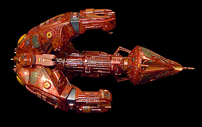 Scale: 1/1400 ORION PIRATE RAIDER Being a loose confederacy of thieves and pirates, The Orion Syndicate has been the scourge of the Alpha quadrant for nearly two centuries. One of the most threatening vessels in the ranks of the Syndicate is the massive Raider. Armed to the teeth, this ship is designed for ambush and attack of freighters and cargo ships and offensive strikes into Federation shipyards. Capable of taking on most other ships even when outnumbered, the Raider a true threat to Federation commerce. The central core and Command Spearhead are surrounded by a trio of massive cargo arm/engine blocks. The three massive arms arc out over the core column like a scorpion tail. At the tip of the arm is a wide cargo bay designed for recovery of commandeered ships and cargo. Each arm sports a powerful tractor emitter on one side and a large dual plasma cannon configuration on the other side. At the aft end of the arm is one of the three engine blocks. The three warp blocks taper down to three glowing warp plasma bubbles, and terminate in three aft-mounted plasma cannons nestled between the Impulse Engine triad. Each bubble is a plasma resonator that cascades, along with the other two resonators. Two bubbles are always in phase simulltatiously cascading around the block. The result is a mesmerizing spinning lightshow. Between each of the warp engine blocks is a two pronged matter collector the feeds the Warp block reactors. On either side of each engine block spines are two grey shield emitters that generate powerful nested multiphasic shields. These emitters work in tandem with the massive emitters on three sides of the conical Command Spearhead. Heavy polarized armor plating protects the Raider should the shields fail. The Command Spearhead is ringed with heavy armor as well, and three more fore-mounted plasma cannons. A triad of navigational deflectors forms the tip of the Spearhead and one last massive cannon reaches from the tip. This weapons configuration can create a devastating tunnel of plasma cannon fire, a bombardment that few vessels shields can stand up to more than a few short minutes. Truly a terrifying sight on the sensors of a freighter carrying anything of value. |