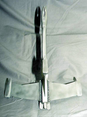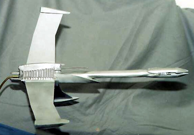 By Joe Brown Scale: 1/1400After the Shadow war and other conflicts had reduced the military resources of the Interstellar Alliance, and in particular of its member the Earth Alliance, a new class of very advanced ships were concieved. The Interstellar Alliance would supply the technology, while the Earth Alliance had the will and resources to construct them in secrecy. The design was based upon technology from the Whitestars, Vorlon and Minbari technology, as well as the latest of technology and research from the Earth Alliance. Finally, after four years of design and construction, the first two prototypes "Excalibur" and "Victory" were completed. More ships will eventually be built, since a fleet of them were planned from the beginning. A Victory Class Destroyer is around two kilometers long, but very manueverable for a ship its size. The ship has four main beam weapons mounted in the nose section, and several beam weapons and anti-fighter pulse cannons in different strategic locations, making the ship capable of firing in any direction. But there is also a super weapon housed in the tips of the three "wings", extremely powerful Vorlon weapon-arrays. When fired, three beams of energy from the tips of the wings combine in front of the nose for a devastating blast. This powerful weapon was however designed for ships with much better reactor output (like a Vorlon ship), so firing this weapon leaves a Victory Class Destroyer dead in space for one minute while all systems recharge. Obviously this weapon should only be used as a last resort. Defensively the hull of the ship is covered by a new plastique/crystalline alloy, capable of reflecting 80% of an energy weapon. A Victory Class Destroyer is capable of carrying many small spacecraft in its docking bays, several shuttles, and two squadrons of fighters. The bridge and most crew areas are located at the base of the top "wing". Model Construction: I built this model shortly after the debut of the pilot movie "A Call To Arms" for the series Crusade. Any design inaccuracies (and there are a few) happened because much better views were available of the ship during the series, which started six months later! The wings are a sandwich of sheet styrene, two exterior thin panels over a thicker inner panel. The main aft hull sections were of various items, including PVC, sheet styrene, and cocktail stirring straws! The forward hull is made from wooden dowels, covered with a layer of Bondo Surfacing putty, and the forward 'petals' are heat-smashed styrene sheet. The very aft end of the hull is from insulation foam, as are the three wing-tip mounted engines. |