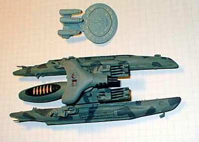 In addition to CNV-BD standard armament, the ships mounted two removable mission specific fire platforms. These platforms mounted port and starboard, used for: Mine laying, Planetary bombardment, Electronic Counter Measures, Observation and Intelligence gathering, Ship-to-Ship combat, or a mixture of all. Vanguard platforms, pictured, carry two turreted quad 190mm railguns, four short-range laser towers (defensive only), multiple ion-bolt infinite repeaters and a single-use planet killer torpedo. Image: Another look at the stern Image: Bow view Image: Pictured along side the refit 1701-D from the STTNG episode "All Good Things..." |