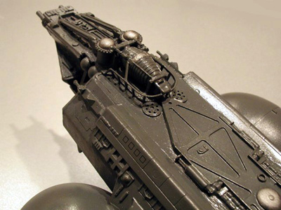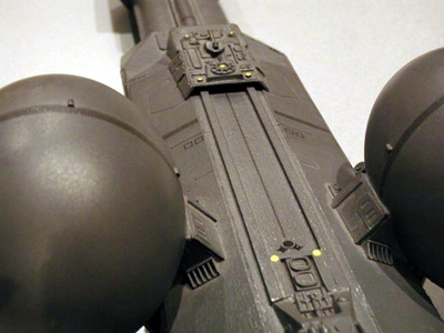 About the model: The ship is modeled in 1/2000 scale and is built primarily from cardboard and bashed kit parts. I also used some computer keys, disposable razors and, of course, two Legg's pantyhose eggs. It is an original design, err... at least as original as I could get with a couple of pantyhose eggs. Image: Bow Image: Hangar detail Image: Detail on the top of the bow |