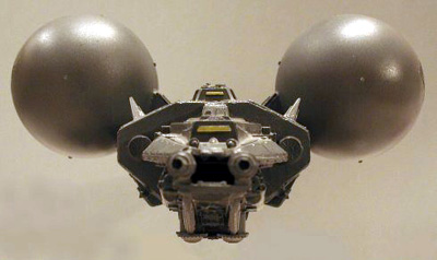 Scale: 1/144 In the early era of mankind's interstellar exploration and expansion, Earth vessels sported rather advanced propulsion and environmental control, but weapons and shielding technologies lagged since there wasn't really anyone else to shoot at. Smaller corvettes and fighters had been developed to handle near-Earth conflicts between nations, but there had been no need for a space-going battlewagon until we bumped in to other races... which we did... hard! The necessities of war dictated that big guns be brought to the front lines quickly. The most practical design called for heavy particle beam and missile systems housed in a heavily armored hull. Few defensive systems were installed since this point-and-shoot behemoth would always be accompanied by a task force of several dozens of Earth's existing small warships. The heavy armoring gave these vessels their nickname of "hard noses". They were also known as "iron coffins" due to their vulnerability to attack. For better survivability, all volatile fluids and ordinance were stored in large canisters that could be separated from the main hull if the ship was expected to receive heavy damage. Although the vessel would not be of much use once the canisters were ejected, it was preferable to losing several million tons of armor that the Earth could not easily replace at that time. Due to their great size and expense, only two of these vessels were commissioned: the Xerxes and the Atreas. Once things cooled-down and more advanced warships took their place, the Xerxes was turned into a museum/war memorial. |
