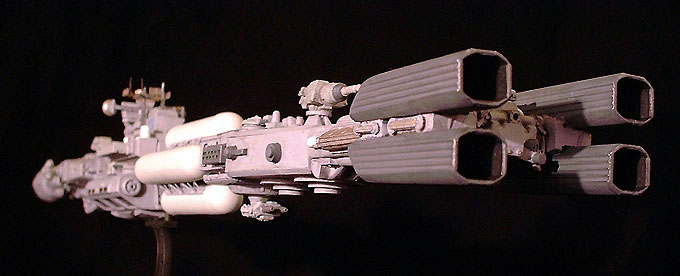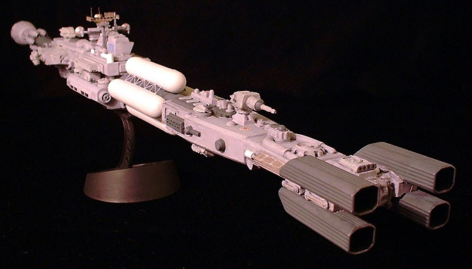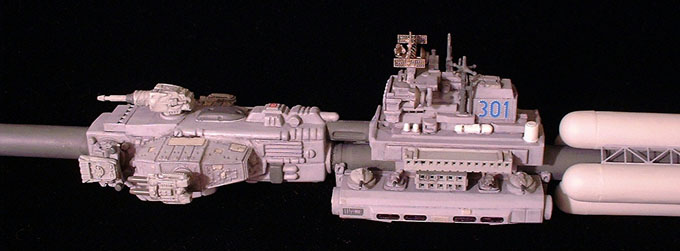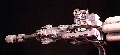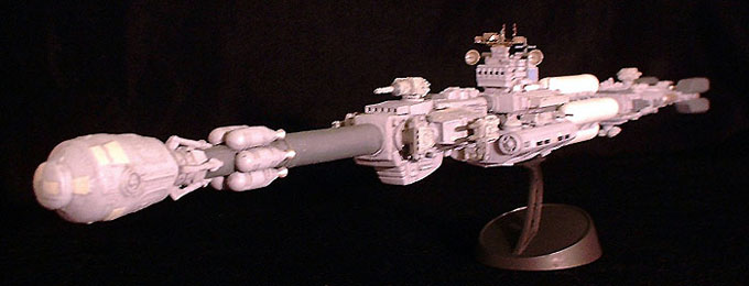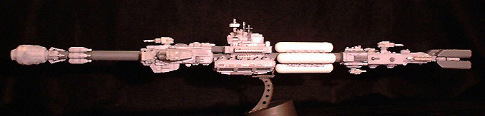 THE ARENA: The year 2104. The asteroid belt colonies have declared independence from Earth, who's world government refuses to relinquish control over them. The belt colonies begin pirate raids on Earth/Jupiter/Saturn system freight convoys to force Earth Gov to negotiate as well as to gain much needed resources that Earth has been withholding to force belt compliance. Earth responds by building warships to escort and defend the convoys. The largest and most powerful ships launched are the Leviathan class Battleships, such as the U. E. S. (United Earth Ship) Typhon. THE SHIP: Named for the Greek god of whirlwinds and destructive storms, the Typhon and 5 sister ships also have the task of hunting down rebel belt forces who have built bases hidden deep within asteroids. To accomplish this, the Leviathan class is armed with the most powerful weapon yet devised - the anti-matter bomb. This large single missile is capable of vaporizing any asteroid in the system, (or laying waste to planet sized bodies). Also armed with a cluster of six 400 megaton nuclear missiles, forward and side mounted tactical nuclear missile launchers, and point defensive missile launchers deploying conventional explosive charges, two on forward turrets, two on the midsection (port /starboard) and one rear mounted. This class also carries an array of high-powered energy weapons for both offensive and defensive purposes. Two 5 terrawatt proton cannons turret-mounted fore and aft provide the primary punch, and are supplemented by 3 twin laser turrets, two flanking the forward proton cannon and one mounted bottom aft, each of 500 megawatt power capacity. Also for point defense are six turreted pulse lasers, 4 on the midsection (2 port, 2 starboard) and two aft just forward the rear proton cannon. The ship also carries a squadron of 6 Cobra attack craft. THE MODEL: Basically an assemblage of parts and bits from the parts box, and a few scratch-built sections. The main assembly went together over a weekend, and detailing added here and there over subsequent weeks. I used some photoetched brass for the antennae array and fuel tank connecting girders. All the guns are from Star Wars (AT-AT & AT-ST) micromachines, as is the nose-mounted anti-matter bomb. Paint job of various grays, white, and steel. The model measures 18 3/4"in length. Image: Underneath Image: Top Image: Center section Image: Center section, perspective view Image: Rear perspective |
