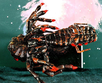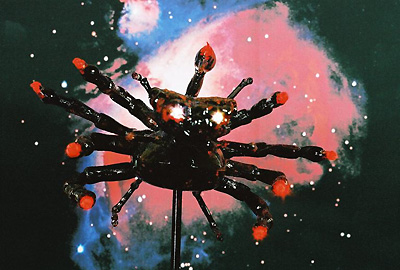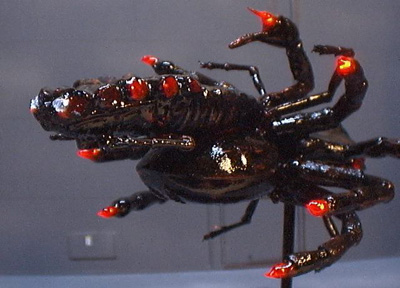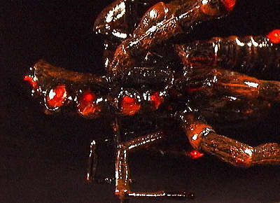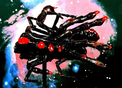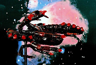 By Clyde Jones Scale: None StatedEarly (Shadow?) Vessel “You want me to translate WHAT? You gotta be kidding.” Later, “If this isn’t a dead language, it should be KILLED!” (Rough translation of submitted document.) Early (Shadow?) vessel. Eater (of) Worlds. (For) pacification (of) unruly/thankless sentients. Sentient (bio-machine? living ship?) savage (of) intent. Need(s) live biological sentient (core/computer?) (to) restrain (hunger?) Jumpgate capable (untranslatable). Weapon (is) Hammer (of) (God? First Ones?) Legs (for) grasping (foes? supplicants?) with energy (web?). The (Model? Votive Figure?) (Is) made (with) Terrestrial (bug? ancestor?) parts. (Plastic). Lighted (with) 29 (Light Seeds? Crystals? LEDs). Two (seeds) are Hammer/weapon. 6 show power (of/in) weapon drive. 8 show (engineering/life?). 4 show (drive/normal space ‘legs’?). 9 show spinners of (web). Controlled (by) (Small mind chip/4060?) by sets (of) function. (Epoxy/spit?) covering (light seeds), filling (holes) in (body). (Paint/coloring/speech?) gloss black, (dry brush/dead folliage?) red, rust, (forward time/Future?) for shine. Image: Head on Image: Rear view Image: Close up of the rear section |