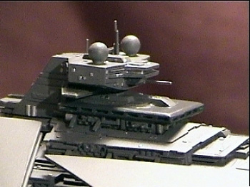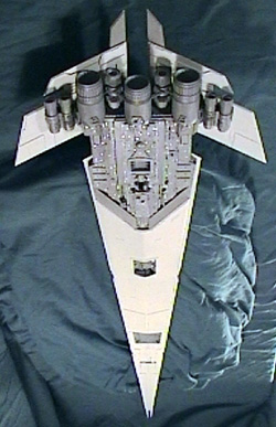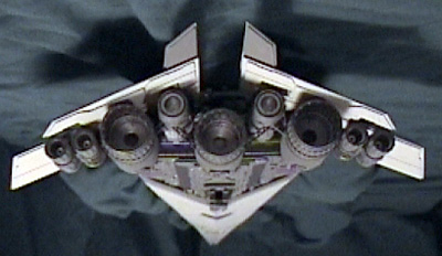 There are parts from a Millennium Falcon kit, as well as a '67 Charger, container caps, and the citizens of my parts box. The antennae were made of straight pins and brass tubing and the deflector shield generators are 6mm plastic BBs. The model was built in several parts: the bridge, the engines, the primary decking, the under side, the wings, and the primary armored hull plating. To these were added extensive detail including gear-well-like constructions that run through the center and undersides of the hull plating. Layer upon layer of .020 styrene was used to give the under side the multilevel look. At this point it was painted with the different basecoats. Then the underhull, engines, wings, and primary decking were all glued together, leaving only the top hull plating to be attached. The details were added before the final assembly of the hull portions. The scribe-lines alone, which cover 90% of the ship, took five days of work. The primary decks were painted with Tamiya Dark Sea Grey and the armor plating is Model Masters Flat Gull Gray acrylics. Various other colors were used in the detailing of the ship. Image: A closer look at the bridge Image: Rear view Image: Starboard side, underneath Image: Bottom view |