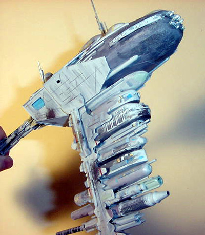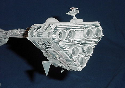 Painting: Basecoat is light grey airbrushed over a dark primer. Dark Ghost Gray and Dark Sea Blue were used to produce shadowing – creating “depth” in the model required significant shadowing. I mixed my own colors for paneling: pale green + light ghost gray, Navy Blue + neutral gray. Gunship Gray, British Crimson, Sand and US Navy Blue were used to simulate laser scorch marks and detailing. References: 4 poor pics of the vessel from Starwars.com, one schematic graciously sent by a fellow Starship Modeler enthusiast, and 1980 "Super Screen Collection" poster produced by Burger King. Image: Looking up at the bow section Image: The back side of the bow section Image: Engines |