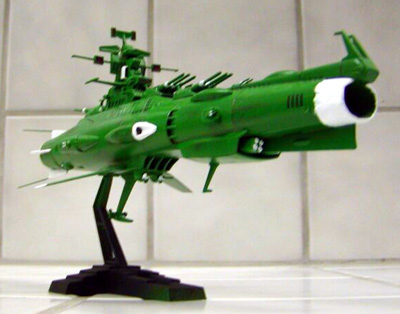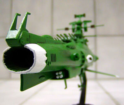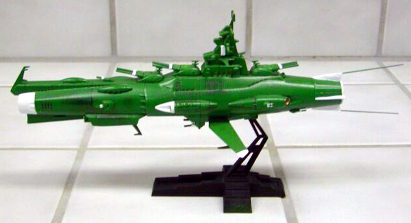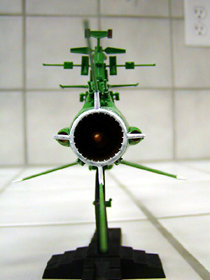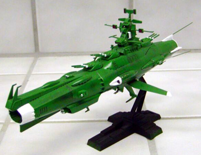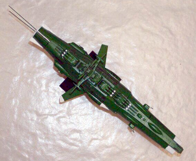 Scale: None stated The Earth Defense Force (EDF) Battleship is a standard vessel used by the human fleet in "Star Blazers". Its main anti-shipping armament is a fixed spinal-mount Wave Motion Cannon, supported by several heavy beam cannon in triple turrets. The design was produced as a stop-gap measure, and as such has many shortcomings; the hull is notably undersized for the weapons battery of the ship and there is a great deal of crowding. Much like naval vessels during Earth World War II, this ship has been refitted with many additional anti-fighter weapon emplacements to counter the growing threat these small craft pose to large vessels. This particular ship is the flagship of the Northern Division, charged with patrolling "above" the plane of the ecliptic. The Northern Division favored a green paint scheme over the standard EDF Grey. These pictures were taken with an Olympus C700 digital camera. Resizing and cropping was done with iView software. Image: Port side view Image: Bow/Wave Motion Cannon detail Image: Stern/Engine detail Image: Top view |