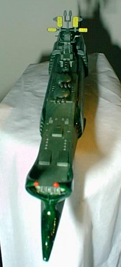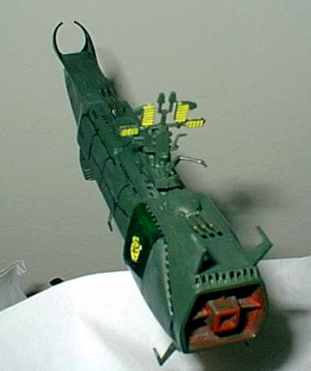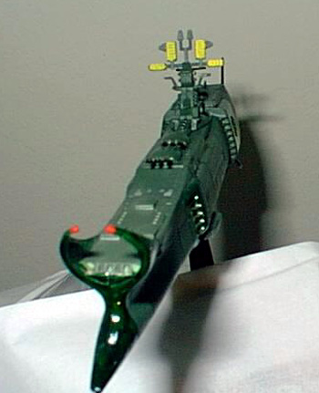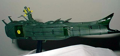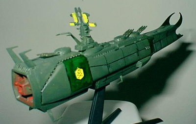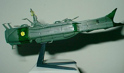 By Chris Condon Scale: 1/1600The Death Shadow is the first ship commanded by Harlock during the war with the Illumidas. One of the most powerful ships in the Earth Space Forces, it is forced to become a refugee transporter as the war ended. Harlock purposely damages the ship when landing on Earth, forcing the Illumidas to decommission it rather than use it. It only appears in the movie "My Youth in Arcadia" briefly in the beginning. It is brimming with weapons. At this scale, it takes a lot of patience to get the detail out of the model. I was stunned at the amount of parts for a ship that slightly larger than a dry eraser marker. I did change the color scheme, in the pictures it is green and light green, which I did not think was appropriate for a warship so I made them darker. The main difficulty with this kit is that the directions are in Japanese. On the other hand, it cost me $5 at an Anime convention. Moreover, what is not to like about a warship with a skull and crossbones emblem on the sides? Image: Another starboard side view Image: Looking down the upper deck Image: Front view Image: Rear view |
