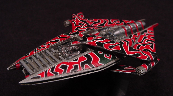 It seems the Narn value offense more than defense. It can carry fighters, which are almost as good as our Starfuries, but less maneuverable. It does carry anti-fighter defenses, but the ship is best in battle against other capitol ships. It mounts two of the same heavy laser cannons that our Hyperions and Omegas mount, after all we did buy the design from them. They can fire those big cannon at a faster rate than we can, though. They have these energy mines which they use as a stand-off weapon. It’s almost like the old photon torpedoes from Star Trek. They can be set to explode like proximity mines or like a missile. It really does a number on enemy fighters. We find it pretty easy to work with the Narns on fleet maneuvers. They’re aggressive, and their systems integrate with ours pretty well unlike the Minbari ships which are still nearly invisble to our sensors and systems. Their commanders were a little reluctant at first to risk their precious ships, instead of using them for planetary defense. Once they committed to the battle, however, they fought balls-out. I’ll tell you this, if you’re stuck planetside fighting for your life, you want Narns by your side. Well, I gotta get going. I need to get some sleep, you never know when the next battle will happen. Hopefully this will be over soon. Take care of yourself and our little sister, The Model The model is an Agents of Gaming miniature, about 4 inches long. It's finished with acrylics and enamels, and drafting pens. Image: Larger view of above |