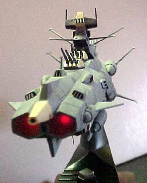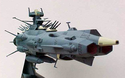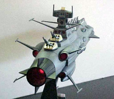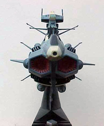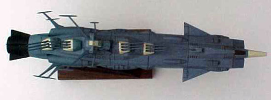 By Scott Sperti Scale: 1/700MODEL DESCRIPTION: 1/700scale Andromeda from the Starblazers cartoon series MATERIALS USED: Stock kit, 3 LED's and a battery pack, Testors spray paint and video's for reference. PAINT: I used Testor's Model Master spray paints in 4 colors; Intermediate blue (Hull), Flat black (Main Engine), Panzer gray (Secondary Engines), and Flat red (side and rear sensors). DETAILS: I used a fine point permanent marker to detail all the panel lines. FEATURES: Main guns rotate. Inner supports for LED's. MODIFICATIONS /CORRECTIONS: This was another kit that I had waited over 15 years to purchase. This kit was more accurate than the 1/500 scale Argo. The only thing I added was the LED's. The engine and wave motion guns were all molded in transparent red and little holders for the LED's came with the kit. There were some mating problems with the 2-underside rear fuel tank / generators, but everything else went together with ease. I did not glue the upper and lower hulls together so I could replace the LED's if needed. All the smaller parts that cover the mating line between the 2 hulls are only glued to the upper hull, but hold tight to the lower hull, eliminating any movement between them. Image: Top view Image: Wave motion guns, lit Image: Bow-on view |