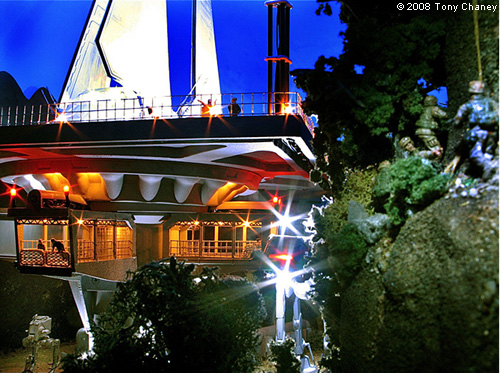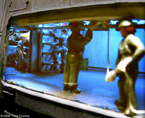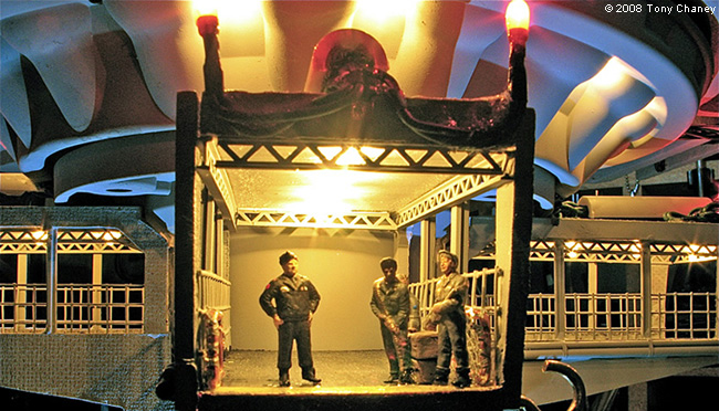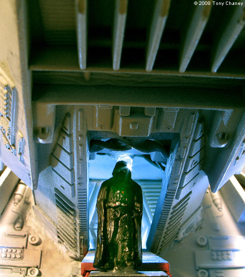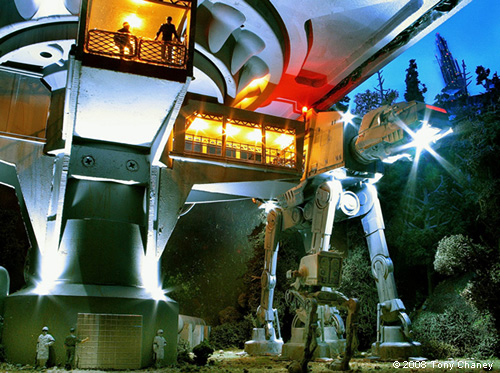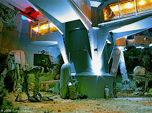 There are some more figures, circa WWII, waiting to load the AT-AT on the gangway (these all came unpainted). The incandescent lights in the gangways and position lights are all mini-Christmas lights, and the spot lights on the AT-AT and pedestal are mini-Christmas LEDs, all bought at Target after Christmas for $4 (string of 18 lights). When I got down to the end, I found the ground area a little bit sparse and uninteresting, so when I ran across the Hasbro/Titanium Series AT-STs I bought two and put them in the scene, adding the handrails, along with a smaller AT-AT in the background. The shuttle has total of 18 LEDs. I also had to cut down the landing struts to make it fit in the space I had. The spotlights are scratch build with 5 LEDs each and the platform position lights are mini-incandescent Christmas lights. I lit the interior of the shuttle, including the cockpit; here's Vader making his egress. I finished off the diorama by putting in a four man Rebel RECON team, who has just repelled to this very precarious location. If you would like to see this diorama as a Quick Time movie, you can watch it on YouTube: or put this in the 'search block': Tydirium Diorama Image: Walker docking Image: Imperial crew Image: More crew Image: Platform support Image: Shuttle from side Image: Darth Vader Image: Rebel infiltrator |