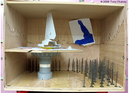 This diorama is my depiction of the landing platform on Endor. It came about after having a MPC Tydirium Shuttle kit laying around in a closet for years, saving it up for really special model project that got forgotten. A year or so ago I saw one on this site that was really well done, which inspired me at the time to dig mine out. However, most of my models are usually set in a diorama, and in doing some research I came upon this artwork of the shuttle landing on the platform on Endor in one of my ILM books, and it was love at first sight. Quickly I realized I would have to make some adjustment to make it a reasonable project: like cutting it in half, reducing the size of the pedestal and gangways and dealing with the perspective of distance. This is where I started a little less than a year ago: with a 30" wide x 22" deep x 22" high box with a slide-out section so I could work on things in the back once I started putting in the landscaping. I bought PVC pipe fittings for the pedestal, capped it with a plastic container that pies come in from the grocery store and bought trees of different sizes for model railroads. I had another AMT/Ertl AT-AT back there in the closet, so I dug it out too. Two off-duty ground crewmen are watching their spit drop from the gangway. Another crewman waits at the elevator door guarded by two Storm Troopers. A second AT-ST also stands on guard. I had planned to light it, along with everything else, but I wanted to do just a little bit more, and after seeing a book on incredible cross sections of STAR WARS machines, I decided I'd put in an interior. These figures weren't as good as ones I found later. I sculpted in Sculpey and outfitted two Speeder Bikes in the cargo hold, but unfortunately they are almost unrecognizable. The closest figures I could get, or at least enough and variety of them, are 1/72nd scale HO figures, and not very good ones at that. I ended up repainting all of them. |