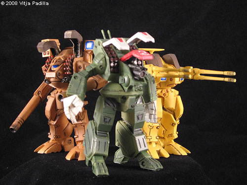 Everything here is from the Macross TV series. First is a 1/72 Hasegawa VF-1 Angel Birds version. Next is Tanmen's Japanese Wonderfest Cat's Eye. My model belongs to the 2nd or 3rd generation of the only 20 "licensed" ever made in the world from him. Nowadays some recasts are found scattered here and there on eBay. The 1/72 Hasegawa Ostrich has a personal painting scheme. This one won the first place on the region 2 (or is it 3..?) IPMS in 2004. Don't recall the category. I don't heavily modify the models, just add little grebblies here and there. Most of the "wow" factor is on the painting technique. Image: Ostrich Image: Another look Image: Cat's Eye Image: Trio of Destroids |