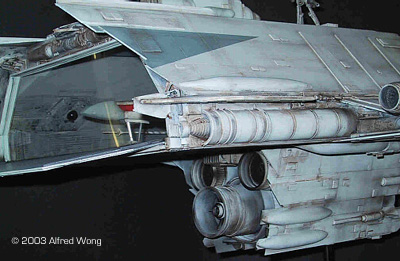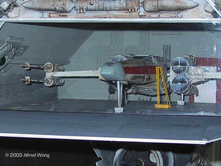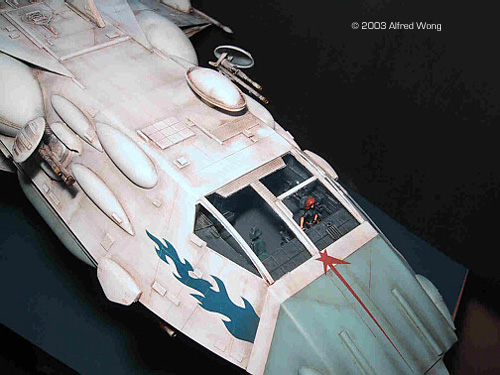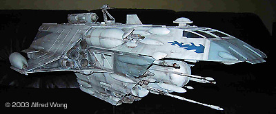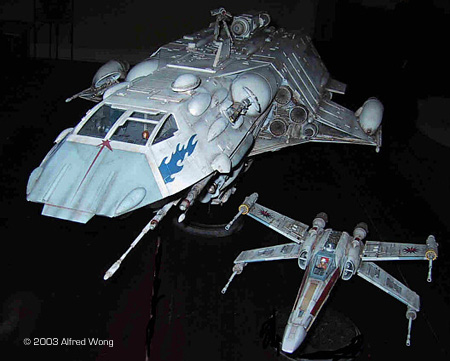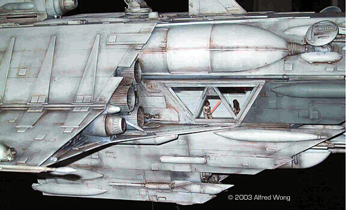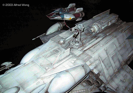 The Model There's little concrete description of the "Jade Saber", other than that its rear hold can hold an X-Wing. That, and the required interior spaces needed for the bridge-like cockpit and the interior rooms determined the size of the model. The model ended up being 35" in length and 21" in span in 1/48 scale. It's probably a bit smaller than it should be, but it's plenty big enough for a model. The cockpit, training room and the hanger all have lighting. I wanted to have Leia and Jaina training with lightsabers with R2 and Luke watching, but after not being able to find a suitable figure to easily turn into Luke, only R2 is in the room watching. Mara is in the cockpit. All the figures were converted/sculpted from pieces of other 1/48 figures. The model was kept to simple lines, making it easier to build and fitting in with the converted-freighter-look of the Star Wars universe. The whole thing is made with 0.060 styrene sheets over a framework and detailed with kit parts. The hanger bay has an opened physical door and a clear piece of plastic to represent a force-field. I also put a little opening hatch for an extended refueling probe (which is actually a separate piece that I slip in when the hatch is opened) that can support one of my Star Wars starfighters. Image: Front/left Image: In formation with X-Wing Image: A-Wing on refueling probe Image: Midships detail Image: Rear detail Image: Hangar Bay, with X-wing Image: Closer look at the hangar bay Image: Saber training Image: Close-up of the cockpit/command deck |