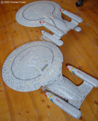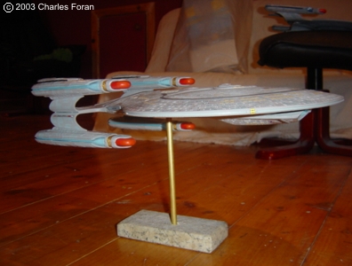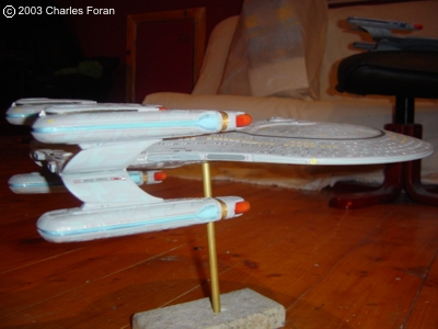 This is my Galaxy-class kitbash USS Proteus. The Proteus was designed primarily as patrol heavy cruiser. This class is not so much used for exploration because it packed quite a bit more punch than a Galaxy class. With its four nacelle configuration it could maintain warp 9.9 for 24 hours. Building this ship was great fun as I posted the buildup on Starship Modeler discussion forum. The buildup was actually quite easy in that the primary and secondary hulls more or less fit quite well in to position. Using layers of sheet styrene to blend in the two hulls took some time as the blending required plenty of cutting, sanding and puttying. In the end the overall shape was acheived using two 1/1400 Enterprise D secondary hulls cut to shape and re-shaped under a hot hairdryer. The final finish was achieved with the addition of the blended phaser strips and new lifepods cut from sheet styrene. The painting started with the basic primer grey but I changed the colour of the aztecing to a light blue as compared to the Enterprise-D in one of the pictures. |