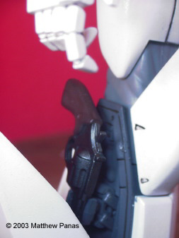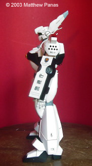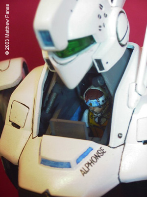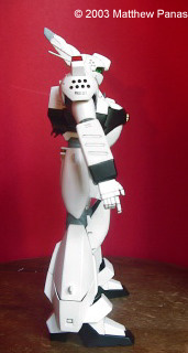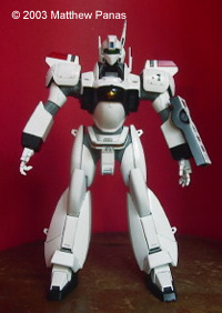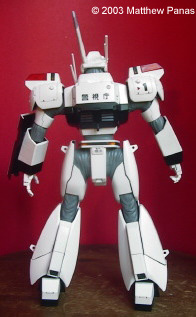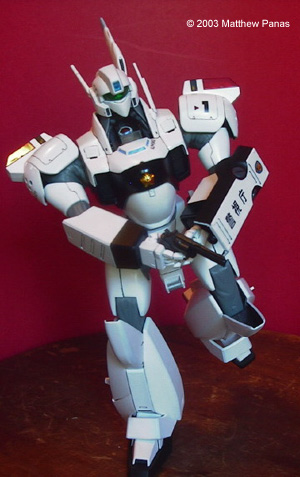 That said, here's something I did over my summer vacation: Bandai's 1/35 MG Patlabor Ingram 1. This was my first swarre back into plastic modeling since I was about ten, my first encounter with a Bandai kit, an import shop, and with Tamaiya paint. Sorry about the red background. The kit built up well, though painting all of those armor shingles was a real pain. It's a fun kit to paint and detail, and is capable of some pretty cool poses, but the screws that hold the knees together seem to loosen when they're flexed back and forth. Moral: Pick something that looks cool and get used to it. It could use a double jointed foot too. It's not capable of the kneeling pose seen on the box art (boo hoo). Still, for anyone who's into Patlabor, or mecha in general, this kit is a faithful representation of the subject and a must have. Image: Freeze! Image: Front view Image: Left side Image: Right side Image: Rear view Image: Closeup, cockpit Image: Closeup, 37mm revolver |